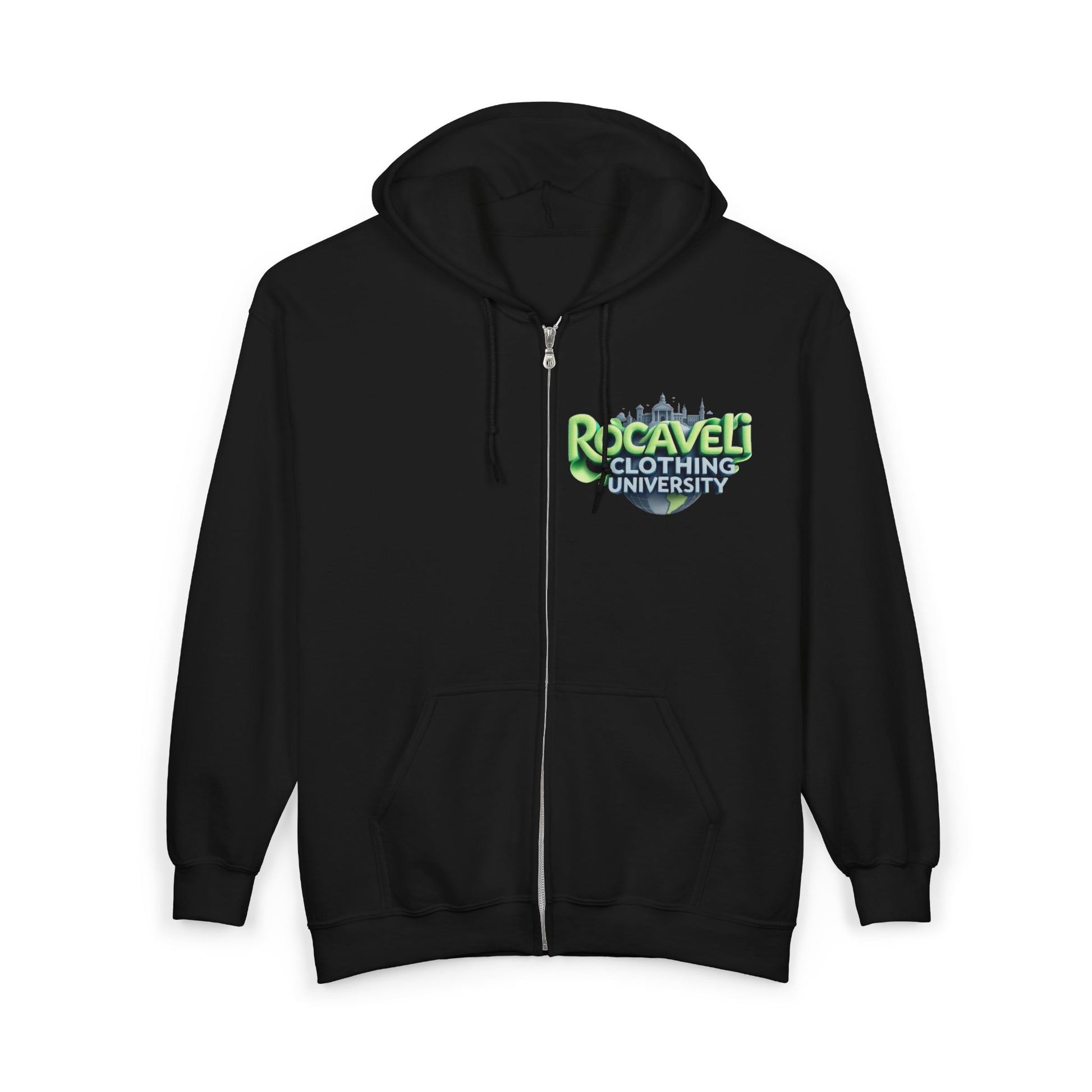 This mid-weight zip hoodie blends everyday comfort with a bold, collegiate-inspired graphic on the chest. The clean black canvas puts the neon-green “Rocaveli Clothing University” emblem front-and-center, giving the hoodie a vintage campus vibe with modern streetwear energy. Soft 50/50 cotton-poly fabric and a classic fit make it easy to layer over tees for morning coffee runs, late-night study sessions, or chill hangouts. Thoughtful details like a metal zipper, roomy kangaroo pockets, and an adjustable drawstring hood keep it practical and lived-in. The design feels like a familiar badge of belonging — worn by those who value comfort, community, and a little playful attitude in their daily uniform.