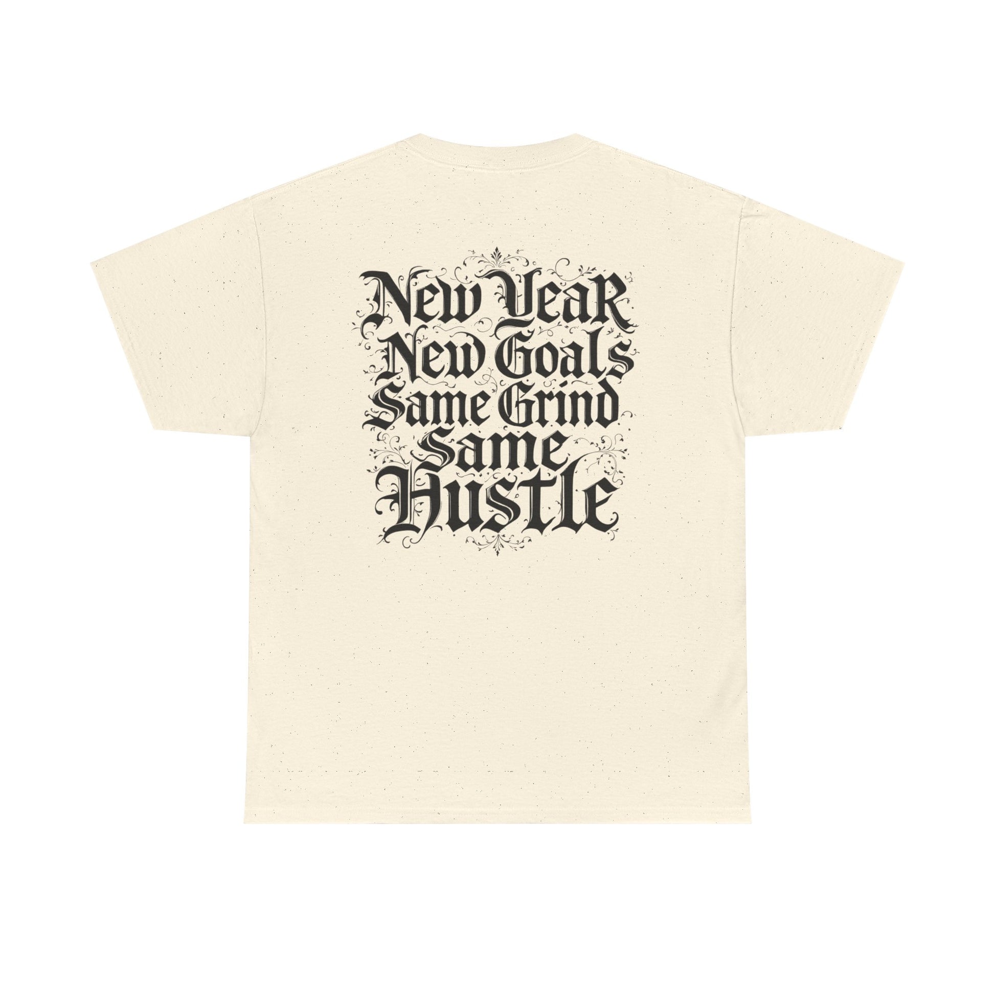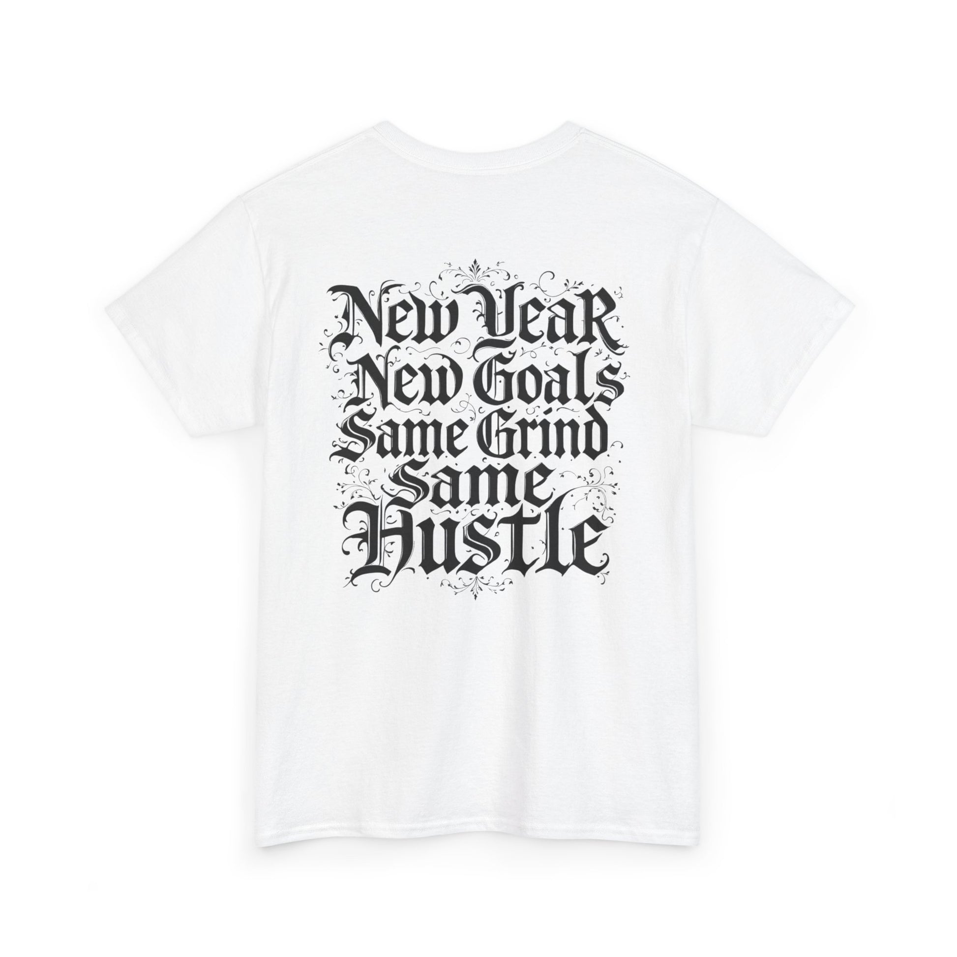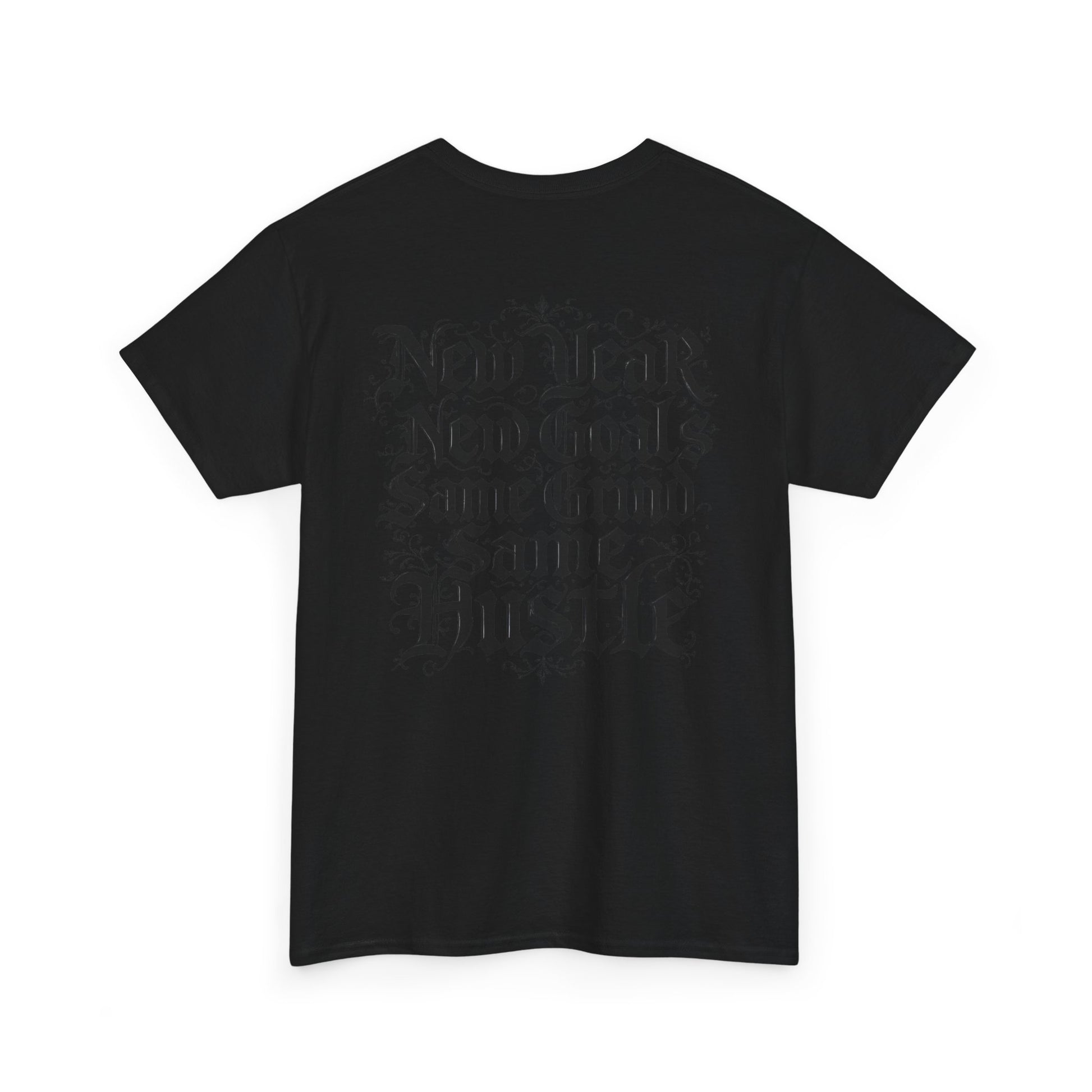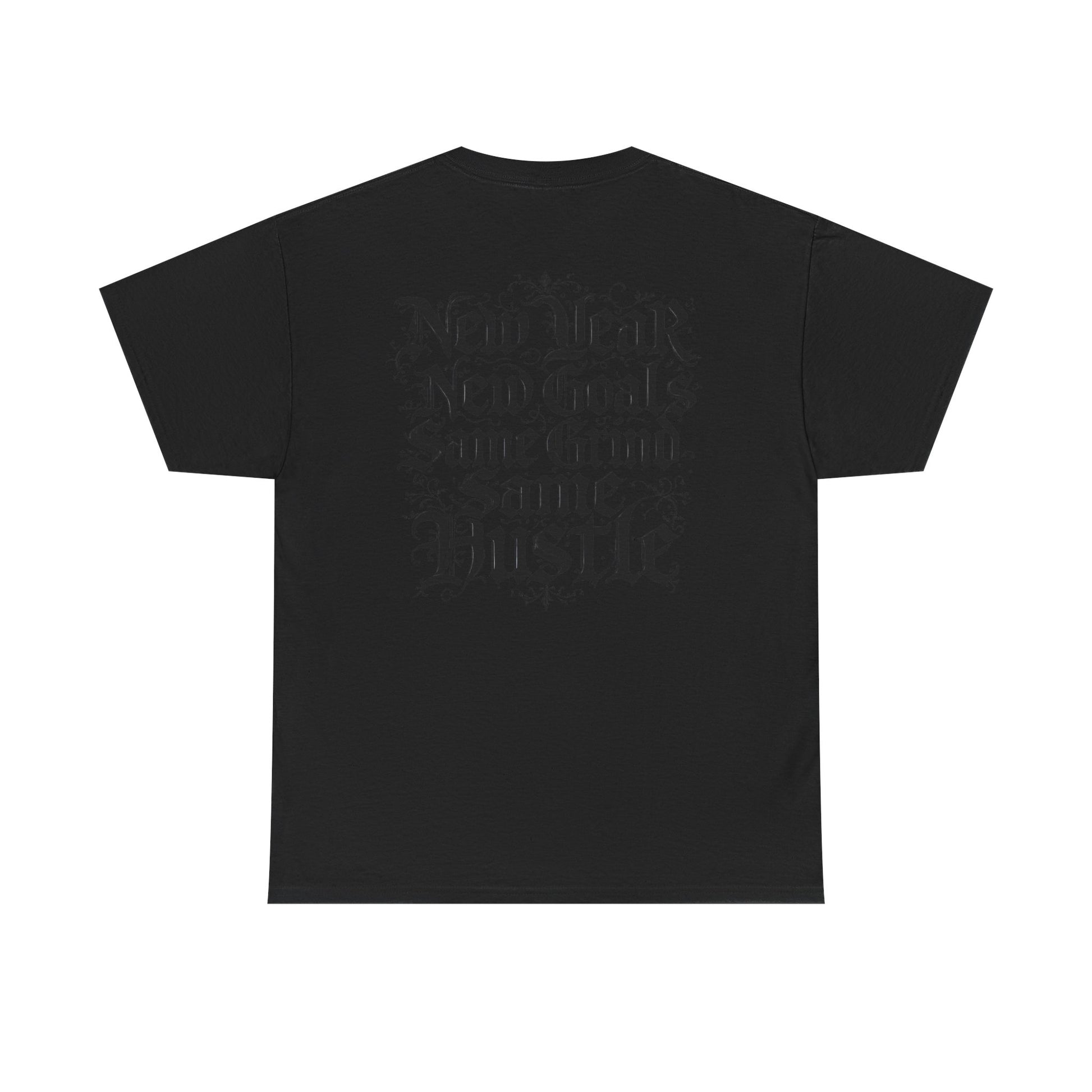 This heavyweight cotton tee carries a raw, streetwise energy—bold gothic lettering and distressed flourishes make a strong statement without shouting. Wear it on long days that demand focus; the front’s ornate logo and the back’s stacked mantra (“New Year / New Goals / Same Grind / Same Hustle”) frame a mindset as much as a look. The fabric’s substantial hand and classic crew silhouette sit comfortably under a jacket or alone as a statement layer. It’s a shirt for people who move with intent, who treat ambition like a habit and style like a signature.