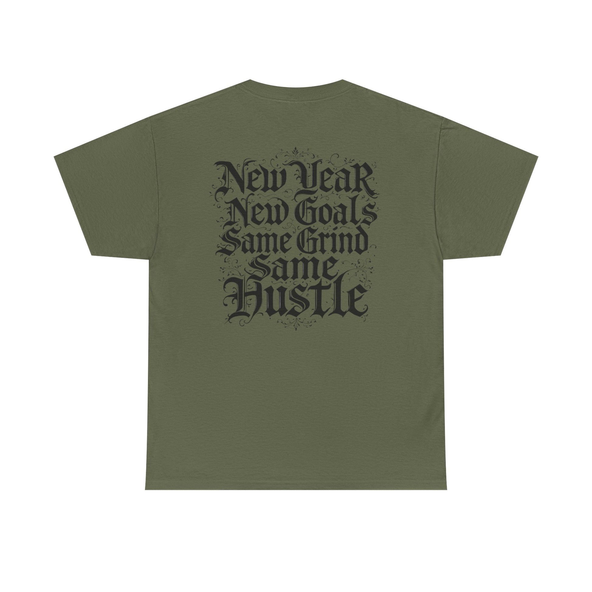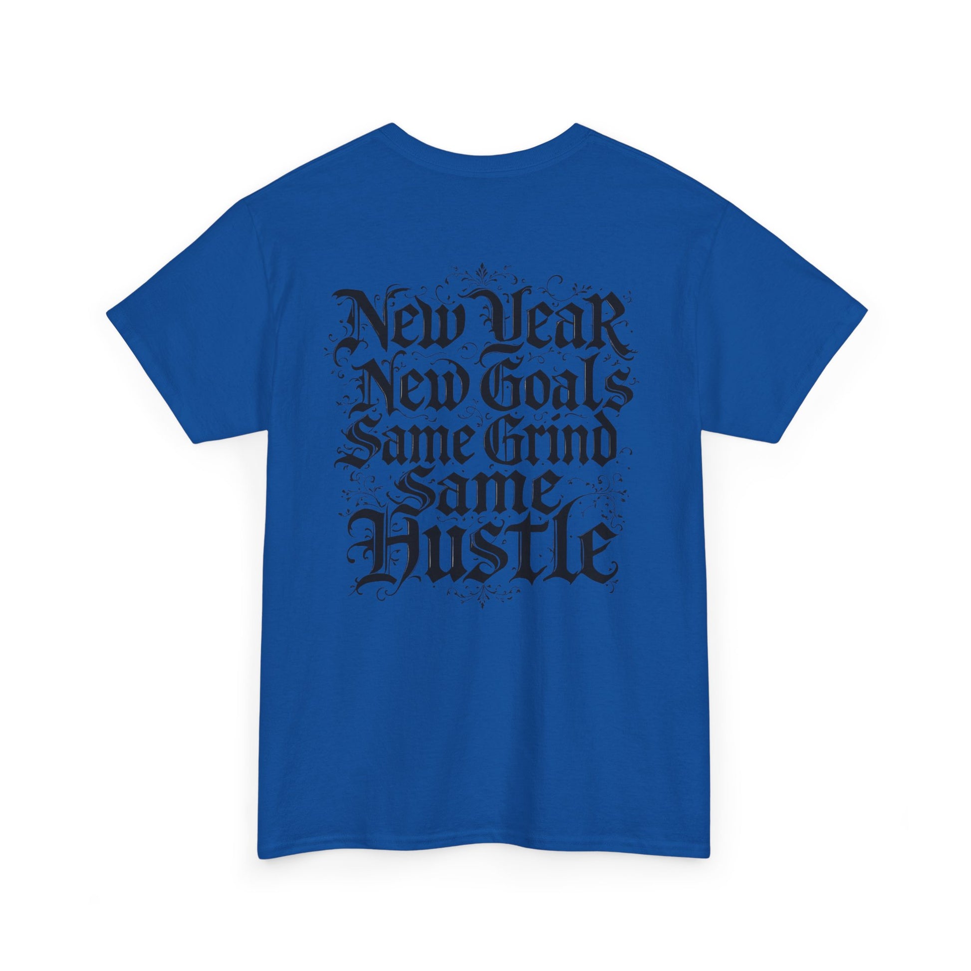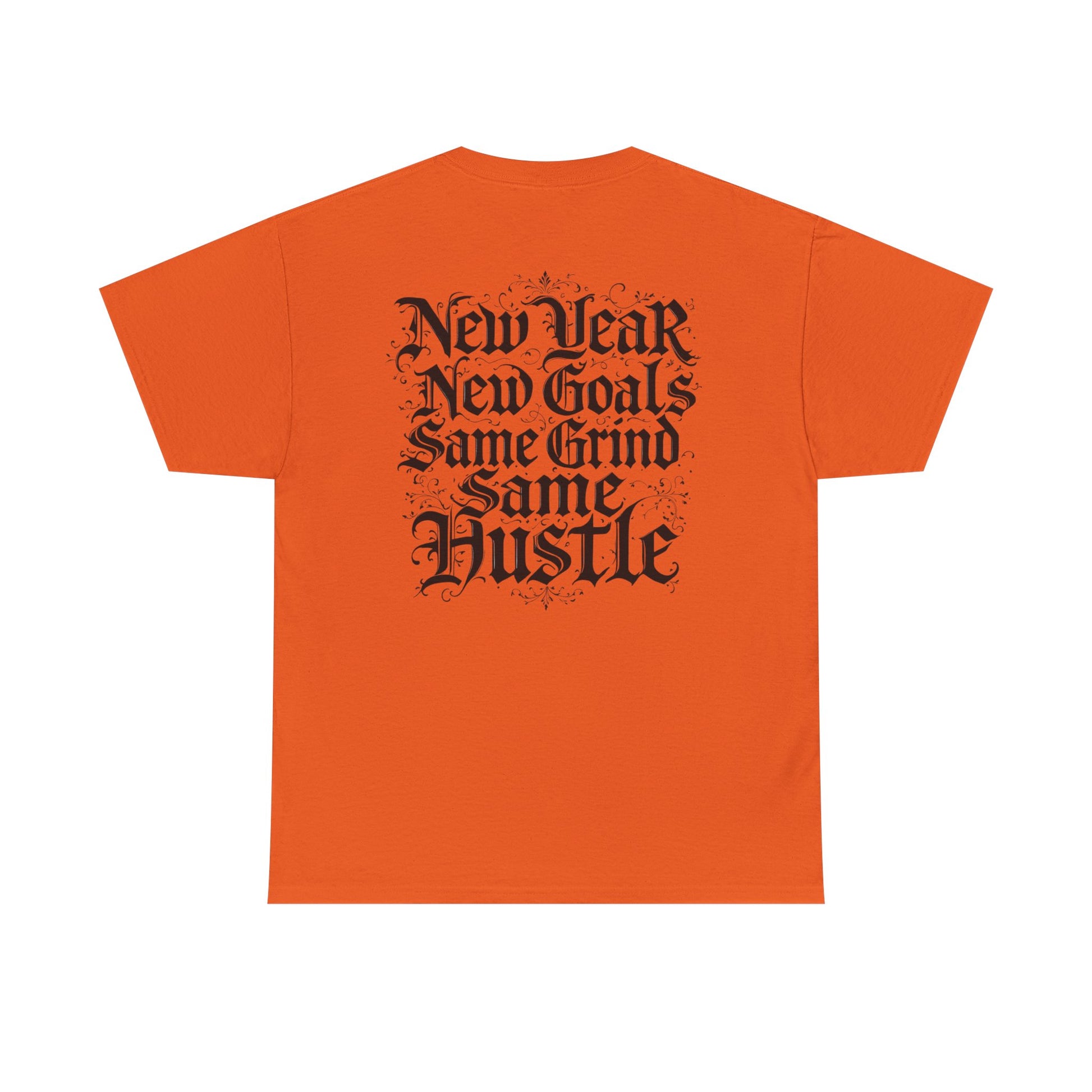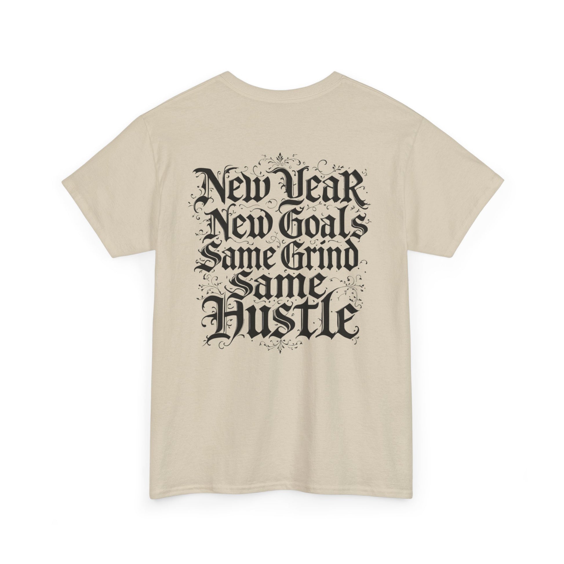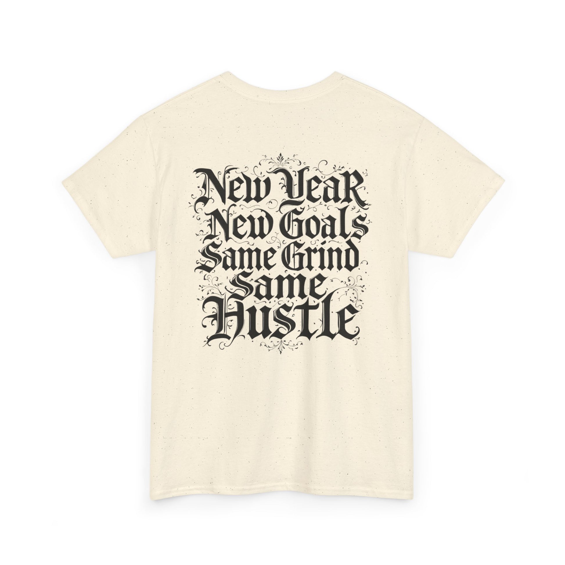 This heavyweight cotton tee carries a raw, streetwise energy—bold gothic lettering and distressed flourishes make a strong statement without shouting. Wear it on long days that demand focus; the front’s ornate logo and the back’s stacked mantra (“New Year / New Goals / Same Grind / Same Hustle”) frame a mindset as much as a look. The fabric’s substantial hand and classic crew silhouette sit comfortably under a jacket or alone as a statement layer. It’s a shirt for people who move with intent, who treat ambition like a habit and style like a signature.