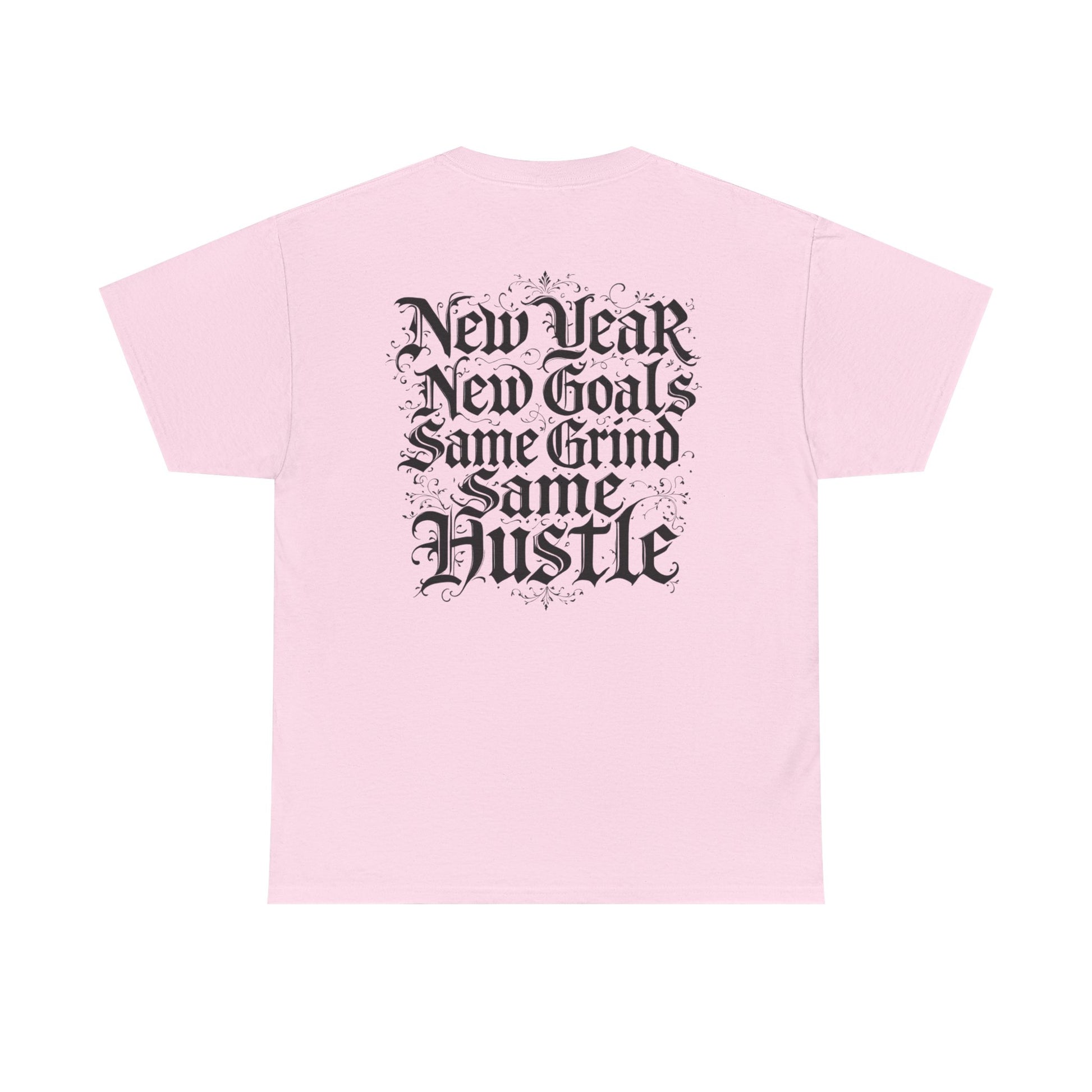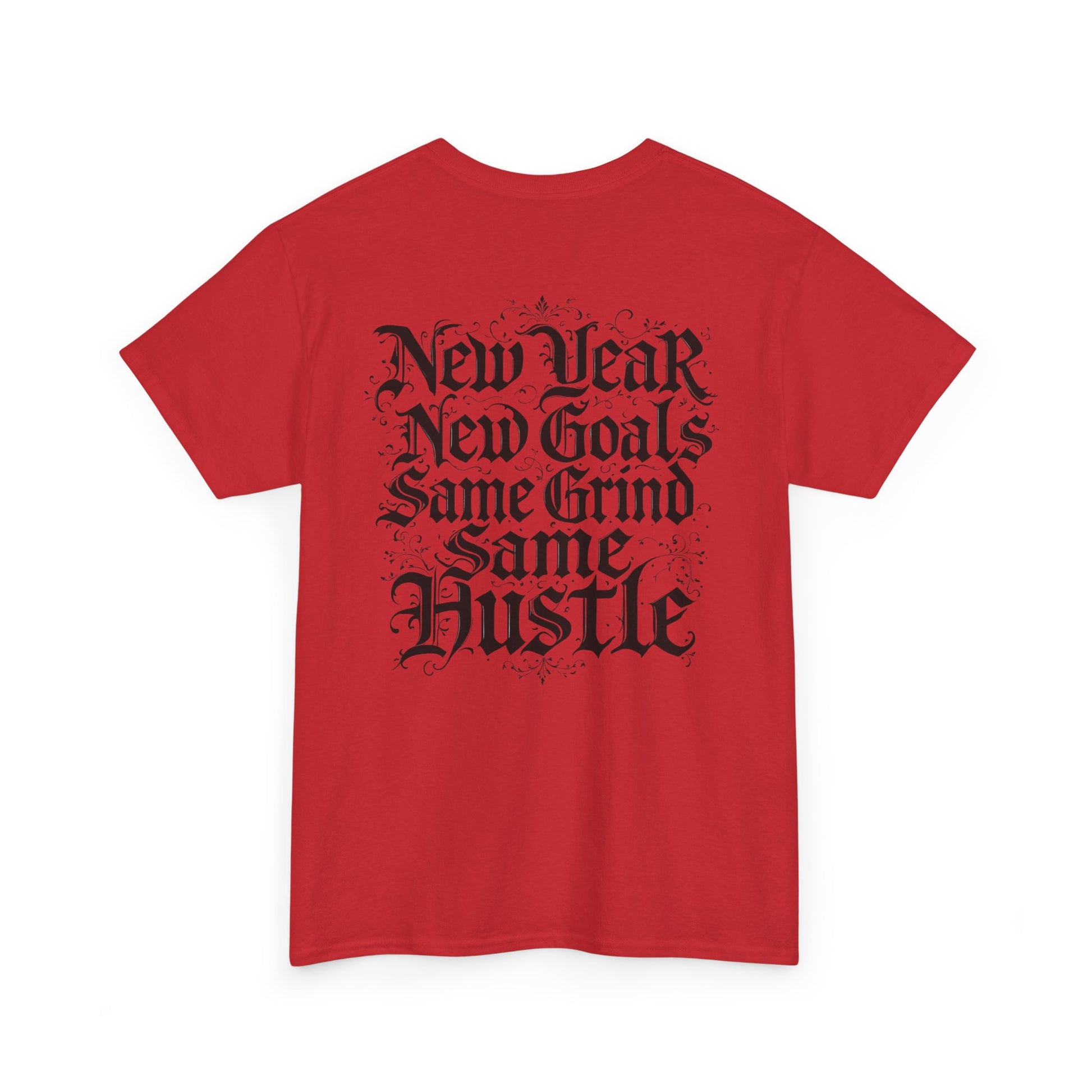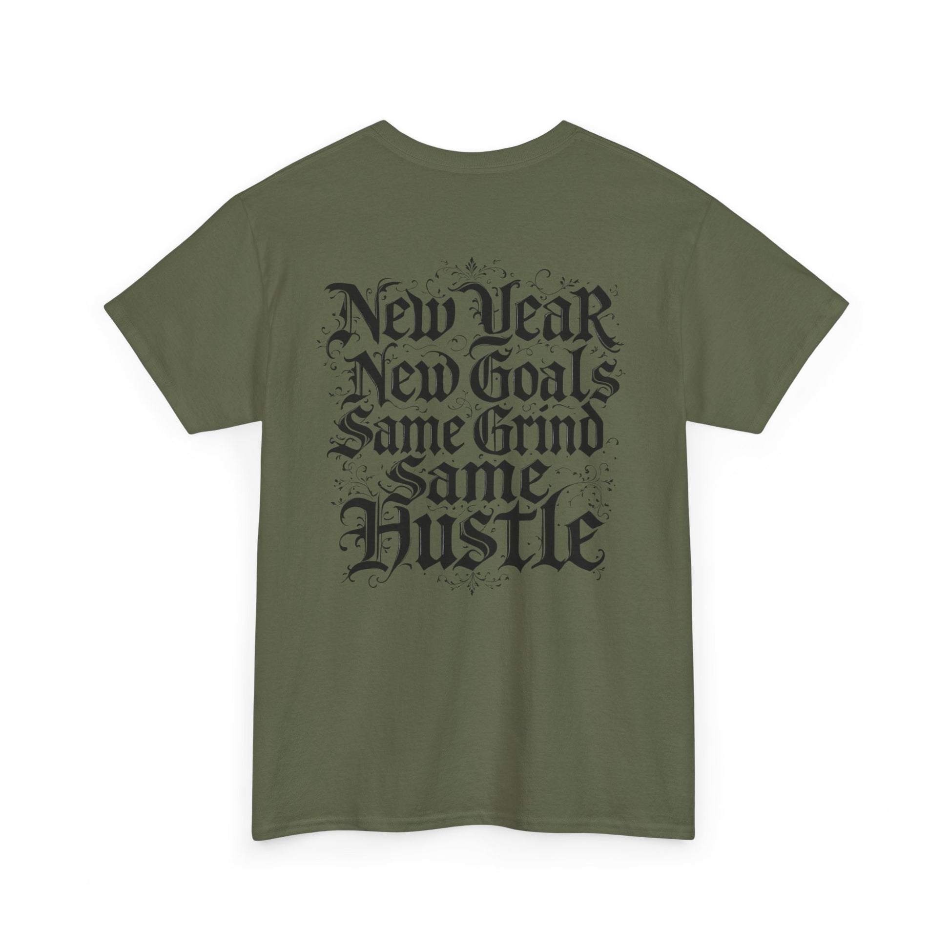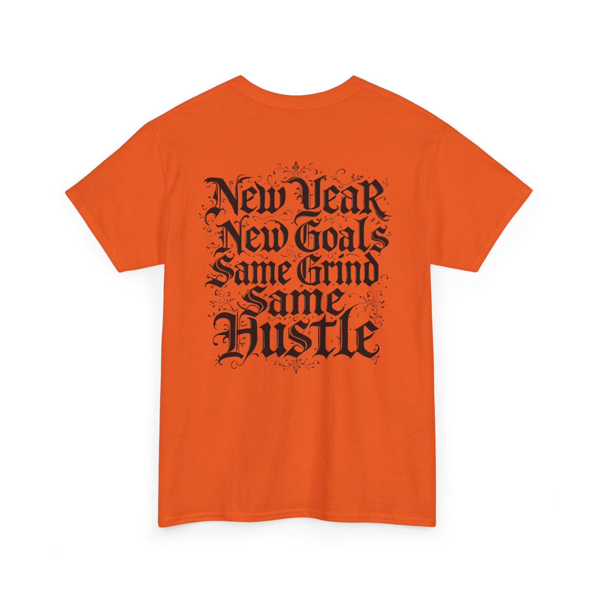 This heavyweight cotton tee carries a raw, streetwise energy—bold gothic lettering and distressed flourishes make a strong statement without shouting. Wear it on long days that demand focus; the front’s ornate logo and the back’s stacked mantra (“New Year / New Goals / Same Grind / Same Hustle”) frame a mindset as much as a look. The fabric’s substantial hand and classic crew silhouette sit comfortably under a jacket or alone as a statement layer. It’s a shirt for people who move with intent, who treat ambition like a habit and style like a signature.