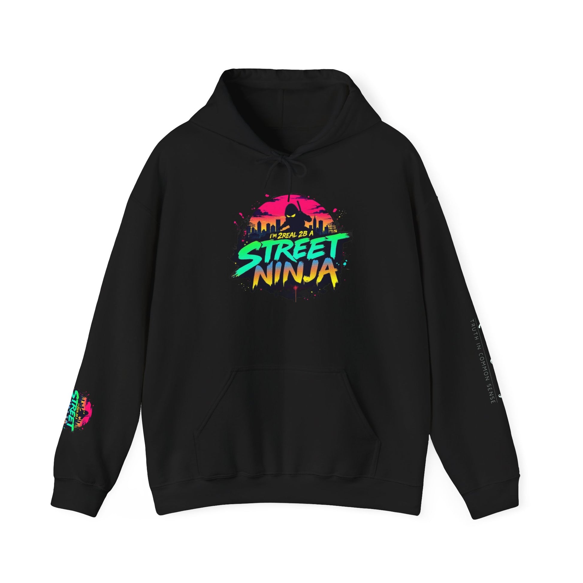 A laid-back, streetwise hoodie that channels neon-soaked city nights and skateboard park energy. The comfy midweight fabric and roomy kangaroo pouch make it easy to layer on cool evenings. A bold, retro-inspired “Street Ninja” graphic sits center chest with a matching patch on the sleeve — vibrant teal and hot-pink tones that pop against the clean white blank. Wear it to morning sessions at the skatepark, late-night runs for coffee, or when you want to carry a little urban attitude without shouting. The double-lined hood, color-matched drawcord, and soft tear-away label keep the vibe durable and scratch-free, while the tubular construction gives a smooth, seamless look that feels put-together even when you’re just hanging out.